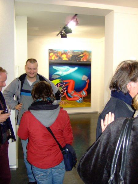 Due to the colors, composition, spontaneity combined with simplistic shapes and a sophisticated sense of humor the artwork of Planet Vivid represents on the one hand playful images and create a feeling of joy. On the other hand our intention is to also show the tough and grown up part of life and not to only create an idealistic world based on child fantasy. Images around the struggle for life are created in a social and urban context. The figurative work may seem tragic and comic at the same time, whereas the comic side partially creates a sense of uneasiness. Exhibition opening Dirk Baumanns, "Baum=Mensch", January 16th 2009. |