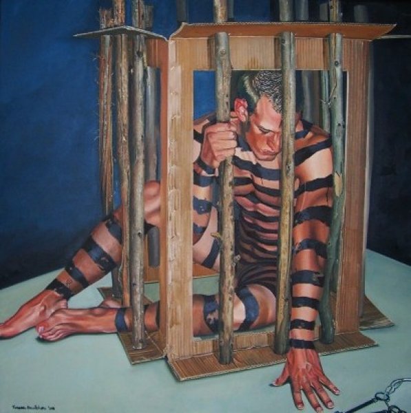 08. Condenado III (The Prisoner) Artist: Teresa Brutcher Materials: Oil on Canvas Size: 100 x 100 cm Other details: Prisoner Series |
